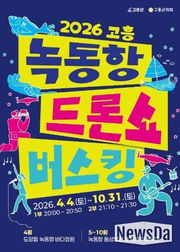 뉴스다 최광묵 기자 | 고흥군은 4월 4일부터 10월 31일까지 매주 토요일 저녁 8시, 녹동항 바다정원 일원에서 ‘2026 고흥 녹동항 드론쇼 버스킹’ 공연을 개최한다고 밝혔다.