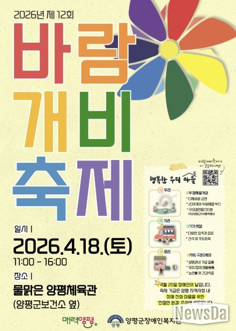 뉴스다 최광묵 기자 | 대한불교조계종사회복지재단이 운영하는 양평군장애인복지관은 오는 4월 18일 오전 11시부터 오후 4시까지 물맑은양평체육관(양평군보건소 인근)에서 제12회 ‘바람개비 축제’를 개최한다.