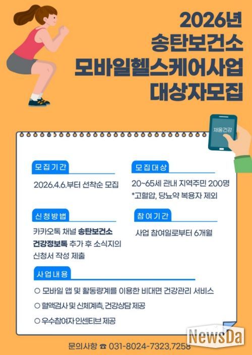 뉴스다 최광묵 기자 | 평택시는 개인 맞춤형 건강관리 사업인 녪년 보건소 모바일 헬스케어 사업’대상자 모집을 오는 6일부터 시작한다고 밝혔다.