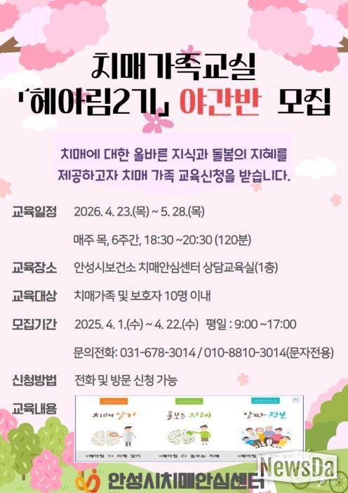 뉴스다 최광묵 기자 | 안성시보건소 치매안심센터가 직장이나 생업으로 낮시간대 교육받기 어려운 치매환자 가족을 위하여 오는 23일부터 가족교실 야간반을 운영한다.