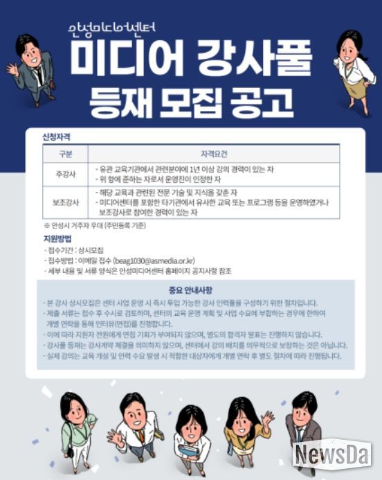 뉴스다 최광묵 기자 | 안성시는 4월 1일부터 보다 체계적이고 전문적인 미디어 교육 운영을 위해 ‘미디어 강사풀’ 등재 강사를 상시 모집한다.