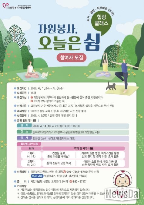 뉴스다 최광묵 기자 | 의정부시자원봉사센터는 4월 1일부터 4월 8일까지 자원봉사자들의 지속 가능한 자원봉사 활동 활성화를 위해 지친 몸과 마음을 회복하는 요가·명상·아로마로 만나는 힐링 클래스'자원봉사, 오늘은 쉼'참여자를 모집한다.