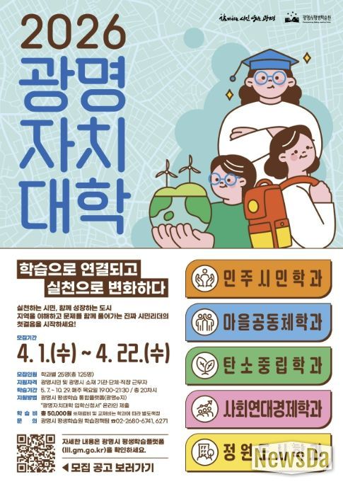 뉴스다 최광묵 기자 | 광명시가 시의 핵심의제인 평생학습 마을리더 양성과정 ‘광명자치대학’ 2026년 신입생 125명을 오는 22일까지 모집한다.