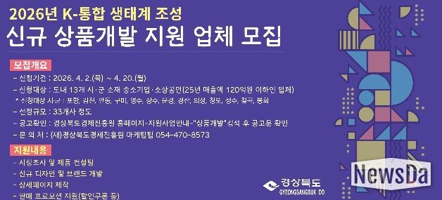 뉴스다 최광묵 기자 | 경상북도는 도내 유망 중소기업·소상공인의 제품 경쟁력 강화를 위해 ‘2026년 K-통합 마케팅 생태계 조성사업’의 일환으로 상품 기획부터 디자인·마케팅까지 전 과정을 지원하는‘신규 상품개발 지원사업’에 참여할 기업을 모집한다.