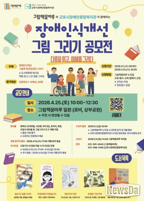 뉴스다 최광묵 기자 | 군포 그림책꿈마루와 군포시장애인종합복지관이 공동 주관하는 장애인식 개선 그림그리기 공모전이 오는 4월 25일(토) 10시부터 그림책꿈마루 로비 및 상부공원에서 진행될 예정이다.
