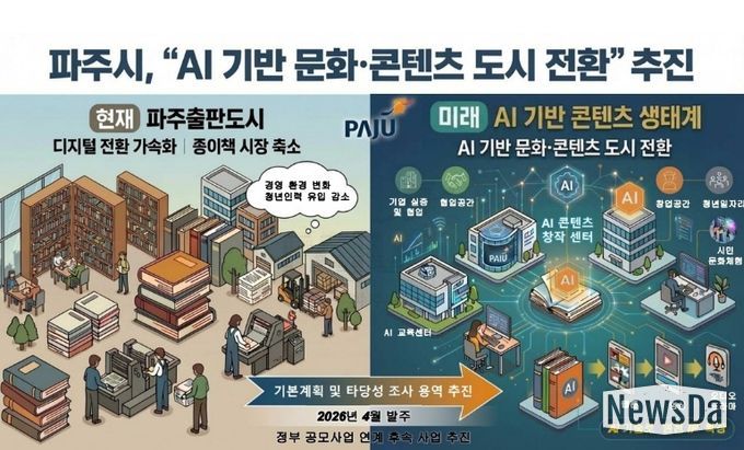 뉴스다 최광묵 기자 | 파주시는 출판도시의 지속 가능한 성장 기반 마련을 위해 “인공지능(AI) 기반 문화·콘텐츠 도시 전환을 위한 기본계획 및 타당성 조사 용역”을 추진한다. 관련 용역비는 2026년 제1회 추가경정예산에 신규 편성·확정됐다.
