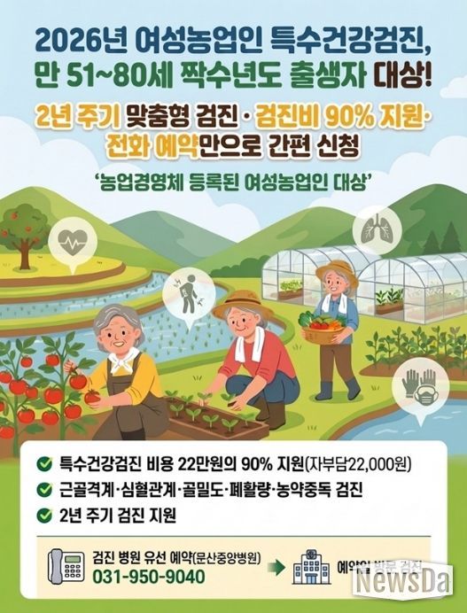 뉴스다 최광묵 기자 | 파주시는 여성농업인의 건강권 보호와 농작업 질환 예방을 위해 ‘여성농업인 특수건강검진 지원사업’을 대폭 확대해 추진한다.