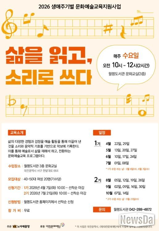 ‘삶을 읽고, 소리로 쓰다’는 이달 7일 오전 10시부터, ‘선율과 문장’은 21일 오전 10시부터 월평도서관 홈페이지에서 선착순으로 모집한다.