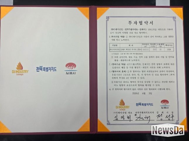뉴스다 최광묵 기자 | 김제시는 전북특별자치도와 함께 도장 전문기업 ㈜디제이산업(대표 김정회)과 3일, 54억 원 규모의 투자협약(MOU)을 서면으로 체결했다고 밝혔다.