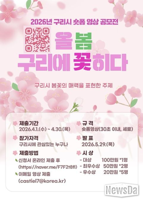 뉴스다 최광묵 기자 | 구리시는 올해 새롭게 시작하는 봄꽃 축제 ‘장자호수 벚꽃마실 축제’를 효과적으로 홍보하고 시민과의 소통을 강화하기 위해 ‘2026 구리시 숏폼 영상 공모전 '올봄, 구리에 꽃히다'’ 접수를 4월 30일까지 진행한다고 밝혔다.