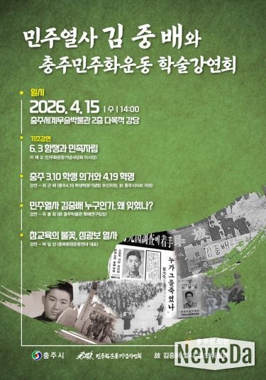 뉴스다 최광묵 기자 | 충주문화원(원장 유진태)은 ‘민주열사 김중배와 충주 민주화 운동’ 이라는 주제로 오는 15일(수) 오후 2시 충주세계무술박물관 2층 다목적강당에서 학술강연회를 개최한다.