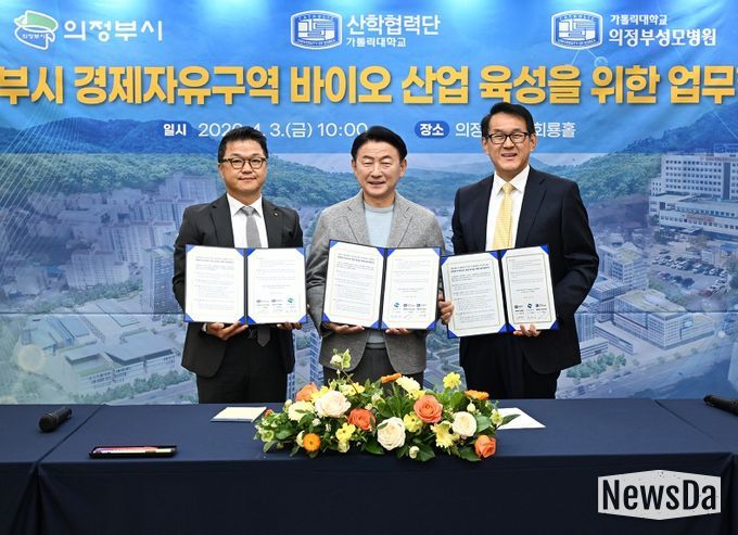 뉴스다 최광묵 기자 | 의정부시는 4월 3일 시청 회룡홀에서 가톨릭대학교 의정부성모병원, 가톨릭대학교 산학협력단과 함께 ‘의정부시 경제자유구역 바이오 산업 육성을 위한 업무협약’을 체결했다.