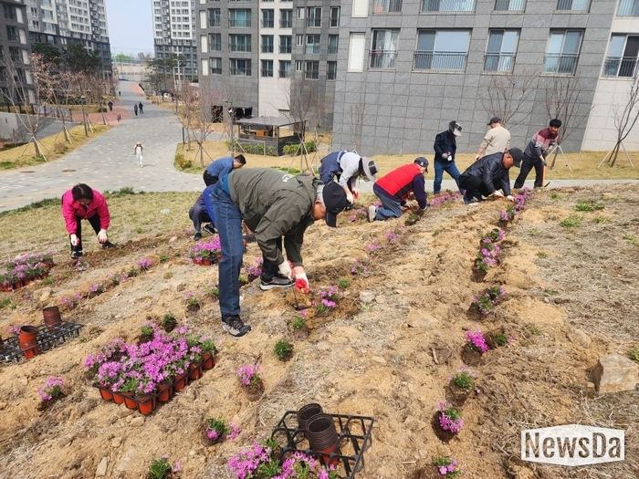 남양읍 서희4차 아파트에서 입주민들이 자발적으로 참여하여 유휴 공간에 꽃동산을 조성하는 활동이 진행되었다.