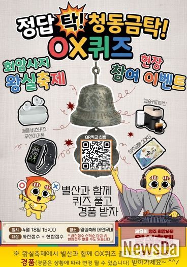 뉴스다 최광묵 기자 | 양주시가 오는 18일 ‘제9회 양주 회암사지 왕실축제’ 메인무대에서 ‘정답 탁! 청동금탁! 별산 OX 퀴즈’를 열고 참가자 400명을 선착순 모집한다.