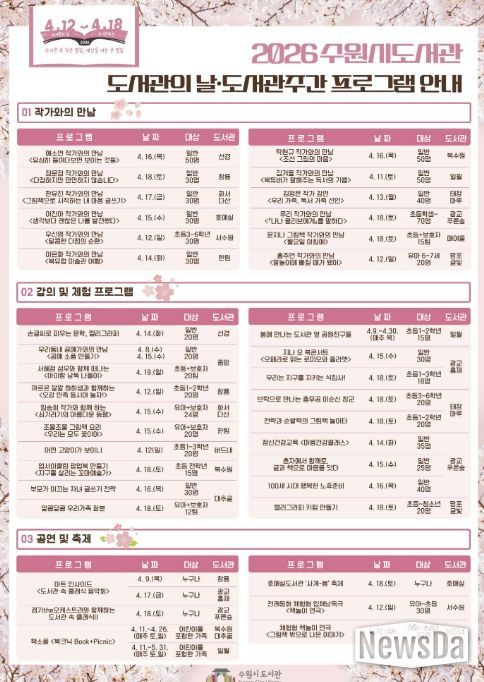 뉴스다 최광묵 기자 | 수원시도서관이 제62회 도서관주간(4월 12~18일)을 맞아 ‘도서관 속 작은 펼침, 세상을 여는 큰 열림’을 주제로 다양한 독서문화 프로그램을 운영한다.