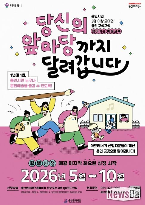 뉴스다 최광묵 기자 | 용인문화재단은 시민이 원하는 시간과 장소로 직접 찾아가는 2026 찾아가는 예술교육 '당신의 앞마당까지 달려갑니다'의 참여자를 오는 4월 7일부터 모집한다.