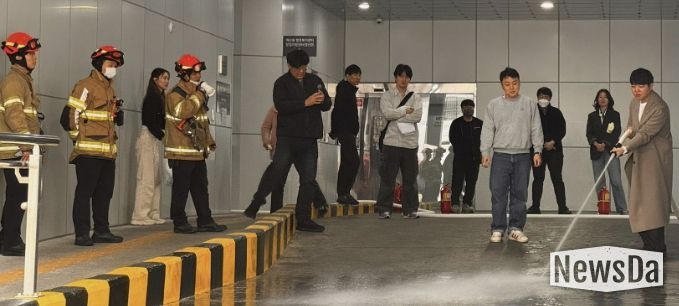 훈련은 화재 발생 시 행동 요령 교육을 시작으로 ▲연기 발생 상황을 가정한 대피 훈련 ▲교육용 소화기 사용 실습 ▲옥내 소화전 살수 실습 순으로 진행됐으며, 참가자들은 실제 화재 상황에 대비한 대응 능력을 체득했다.