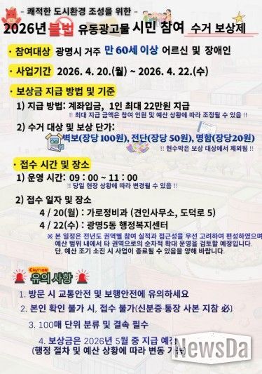 접수는 오는 20일 가로정비과 사무실(견인사무소)에 이어 22일 광명5동 행정복지센터에서 진행한다. 운영 시간은 양일 모두 오전 9시부터 11시까지다.