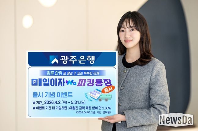 뉴스다 최광묵 기자 | 광주은행은 예비 자금의 입출금이 자유로우며, 하루만 맡겨도 이자를 받을 수 있는 ‘매일이자Wa파킹통장’을 4월 2일에 출시했다고 밝혔다.