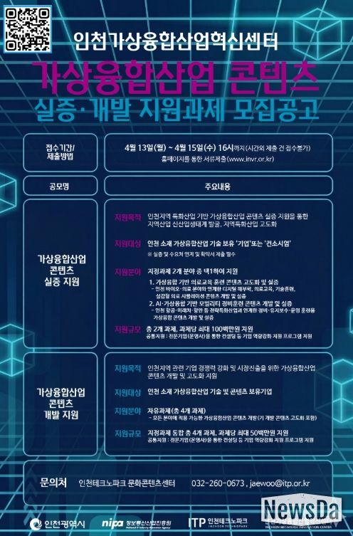 신청은 4월 15일 오후 4시까지 인천 가상융합산업 혁신센터 누리집 을 통해 온라인으로 접수하면 된다.