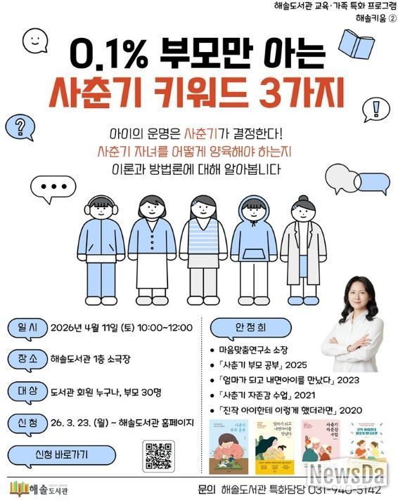 뉴스다 최광묵 기자 | 파주시 해솔도서관은 오는 4월 11일 '사춘기 부모 공부'(가치창조, 2025)의 안정희 작가를 초청해 ‘해솔키움’강연을 진행한다.