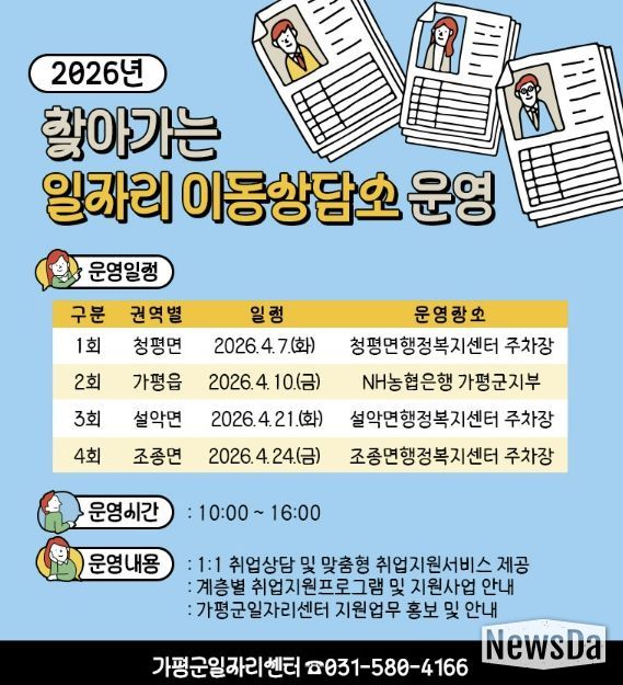 상반기 일정은 △4월 7일 청평면 행정복지센터를 시작으로 △10일 NH농협은행 가평군지부 △21일 설악면 행정복지센터 △24일 조종면 행정복지센터 등 관내 주요 거점을 순차적으로 방문할 예정이다. 일자리 이동상담소 운영 시간은 오전 10시부터 오후 4시까지다.
