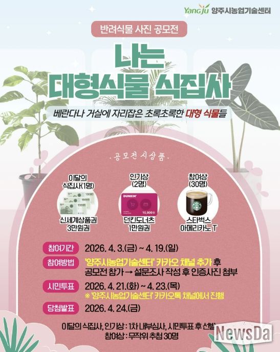 뉴스다 최광묵 기자 | 양주시농업기술센터가 시민과 함께하는 도시농업 문화 확산을 위해 ‘2026년 반려식물 사진 공모전’4월 참여자를 모집한다.