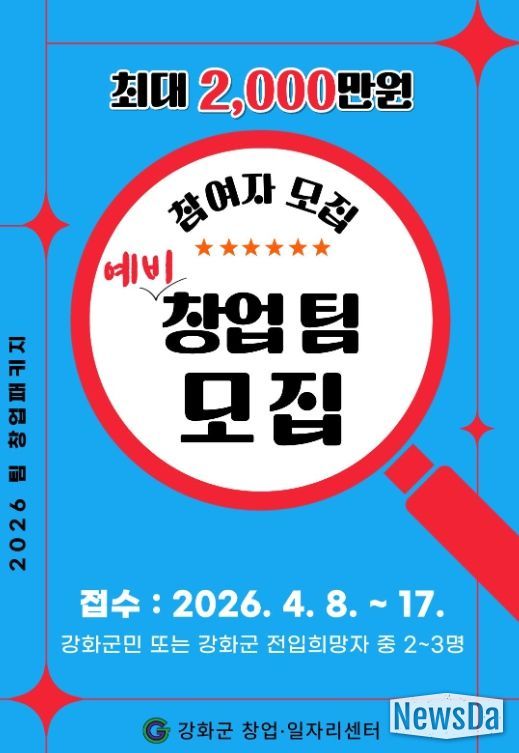 뉴스다 최광묵 기자 | 강화군 창업·일자리센터가 '2026년도 팀 창업패키지 지원사업' 참여자를 모집한다.