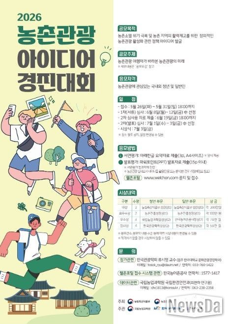 뉴스다 최광묵 기자 | 농림축산식품부와 농촌진흥청은 ‘농촌관광 여행자가 바라본 농촌관광의 미래’란 주제로'2026년 농촌관광 아이디어 경진대회'를 공동으로 개최한다고 밝혔다.