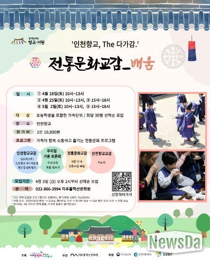 한편, ‘전통문화 교감_배움’ 프로그램은 초등학생 포함 가족 단위(회차당 30명 선착순) 대상이며, 참가비는 1만 원이다. 신청은 4월 3일 오후 2시부터 온라인을 통해 가능하며 자세한 사항은 미추홀학산문화원으로 문의하면 된다.
