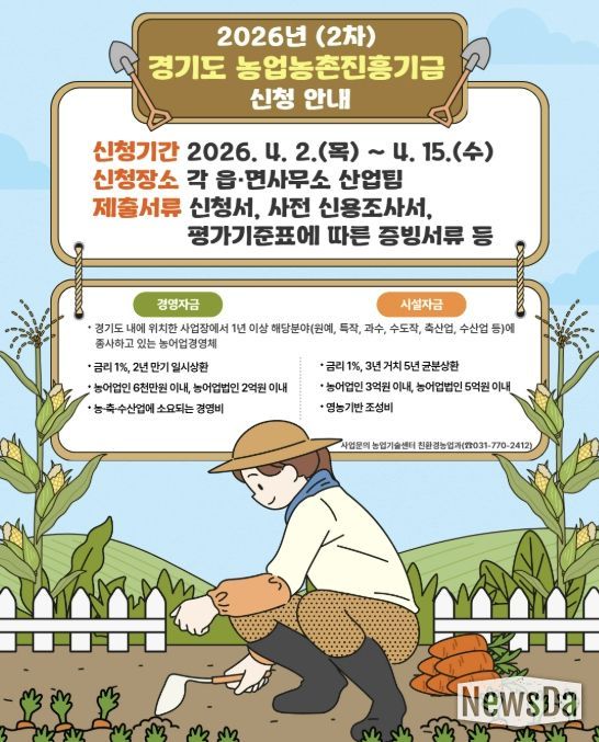 뉴스다 최광묵 기자 | 양평군은 농어업인의 소득 향상과 삶의 질 개선, 경영 안정을 도모하고 농업 경쟁력 강화를 위해 ‘2026년 경기도 농업농촌진흥기금 경영 및 시설자금 지원’ 2차 대상자를 모집한다고 밝혔다.