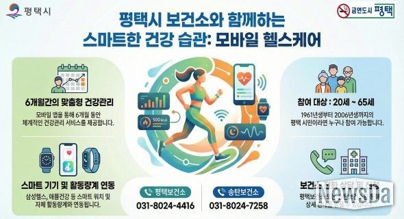 뉴스다 최광묵 기자 | 평택시가 시민들의 만성질환 예방과 건강한 생활 습관 형성을 돕기 위해 ‘2026년 보건소 모바일 헬스케어’ 사업을 시작하고 참여자를 선착순 모집하고 있다.
