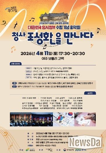 뉴스다 최광묵 기자 | 여주시는 여주 보통리 고택 독립운동가 조성환 생가에서 오는 4월 11일 오후 7시, 우리 고장 국가유산 활용사업으로 일환으로 ‘2026 여주 보통리 고택 달빛 음악회’를 개최한다.