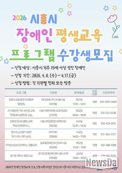 뉴스다 최광묵 기자 | 시흥시가 관내 성인 장애인의 학습권 보장과 사회참여 확대를 위해 ‘2026년 장애인 평생교육 프로그램 지원사업’을 본격적으로 시작하며, 4월 8일부터 17일까지 프로그램 운영을 위한 학습자를 모집한다.