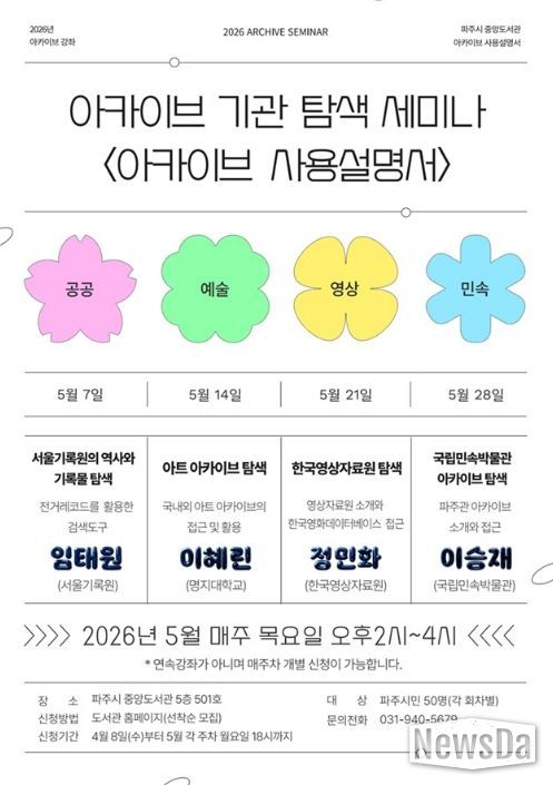 뉴스다 최광묵 기자 | 파주시 중앙도서관은 오는 5월 7일부터 5월 28일까지 매주 목요일 중앙도서관 501호에서 기록보관기관 탐색 강좌 ‘아카이브 사용설명서’를 운영한다.