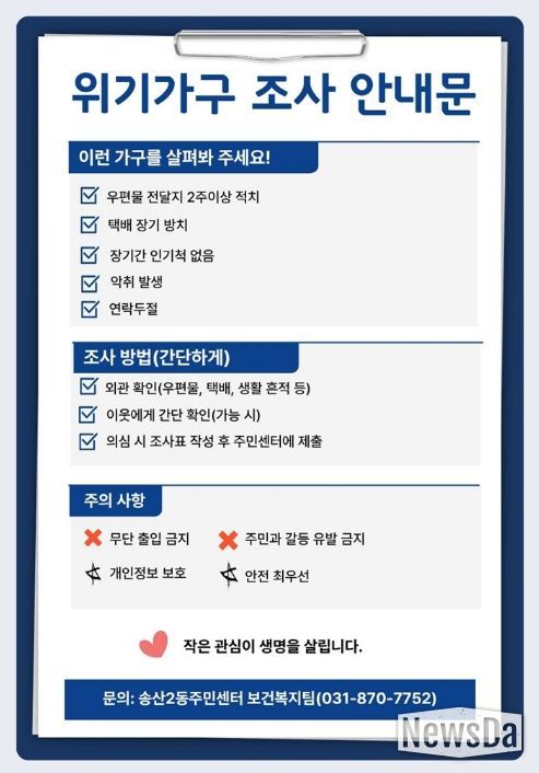 뉴스다 최광묵 기자 | 의정부시 송산2동주민센터는 2026년 상반기를 맞아 취약계층 집중 거주지역을 대상으로 위기가구 발굴‧지원 조사를 본격 추진한다.