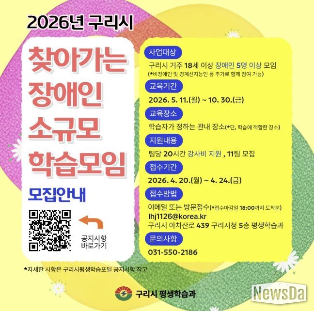 뉴스다 최광묵 기자 | 구리시는 장애인의 특성을 고려한 찾아가는 평생학습 프로그램을 통해 학습 사각지대에 놓인 학습자를 발굴하고, 평생학습 기회를 확대하기 위해 ‘2026년 찾아가는 장애인 소규모 학습모임 지원사업’ 참여 모임을 4월 20일부터 모집한다고 밝혔다.