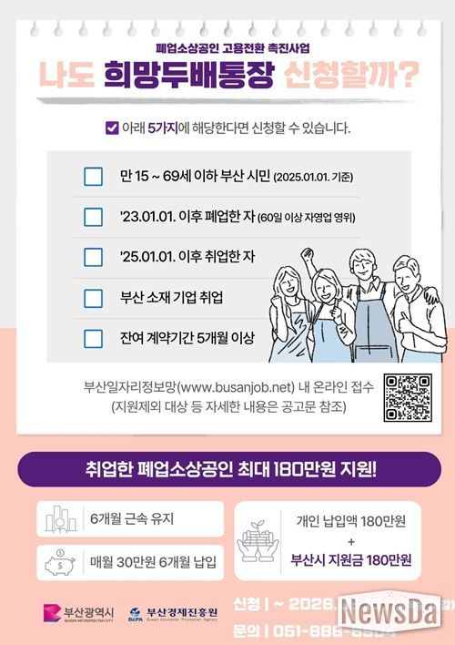 2023년 이후 폐업한 부산 거주 소상공인이 2025년 이후 부산 소재 기업에 취업하면 신청할 수 있으며, 참여자가 월 30만 원씩 최대 6개월간 적립하면 동일 금액을 시비로 추가 지원하는 방식이다.