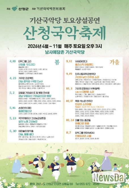 뉴스다 최광묵 기자 | 산청군은 지역 대표 관광지에서 공연을 즐길 수 있는 ‘2026년 상설 문화관광 프로그램’을 운영한다고 9일 밝혔다.