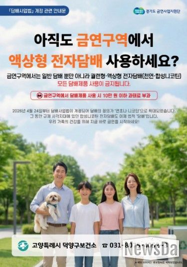 뉴스다 최광묵 기자 | 고양특례시 덕양구보건소는 개정된 '담배사업법' 시행에 따라 오는 24일부터 금연구역 내 담배제품 사용에 대한 지도·점검을 강화한다.