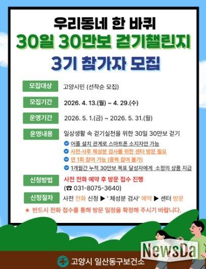 뉴스다 최광묵 기자 | 고양특례시 일산동구보건소는‘우리동네 한 바퀴 30일 30만보 걷기 챌린지’ 3기 참가자를 오는 13일부터 모집한다. 해당 프로그램은 지역 주민의 기초 체력 증진과 일상 속 신체활동 활성화를 위해 진행한다.