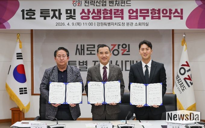뉴스다 최광묵 기자 | 강원특별자치도는 4월 9일, 도청 본관 회의실에서 강원 미래산업을 견인할 [강원 전략 산업 벤처펀드]의 첫 번째 투자기업으로 기능성 바이오 소재 기반 사료첨가제 제조기업인 [밸류라움바이오]를 선정하고 이를 기념하는 [강원 전략산업 벤처펀드 제1호 투자 및 상생협력 협약식]을 개최했다.