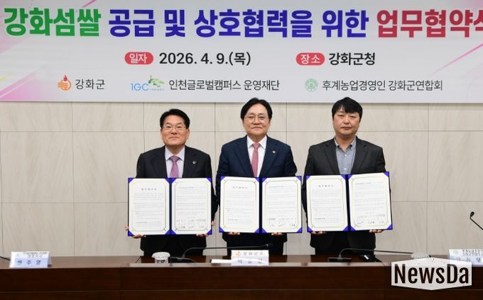 강화군은 9일, 인천글로벌캠퍼스운영재단(대표이사 변주영), (사)한국후계농업경영인 강화군연합회(회장 고진우)와 함께 ‘강화섬쌀 공급 및 상호 협력’을 위한 업무협약(MOU)을 체결했다고 밝혔다.