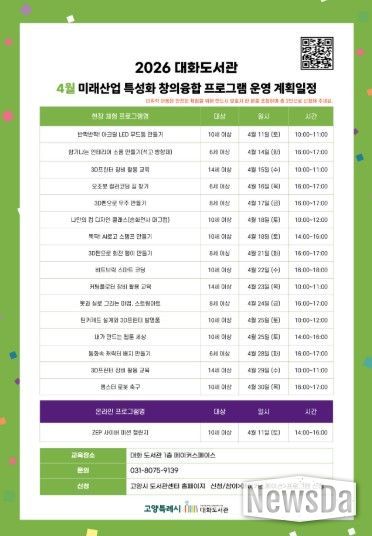 뉴스다 최광묵 기자 | 고양특례시 대화도서관이 4월 11일부터 30일까지 ‘미래산업 특성화 창의융합 프로그램’을 운영한다고 9일 밝혔다.