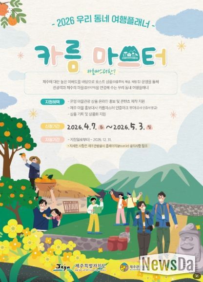 뉴스다 최광묵 기자 | 제주특별자치도와 제주관광공사(사장 고승철)는 오는 5월 3일까지 온라인 채널을 통해 제주 마을 관광을 기획ㆍ운영할 ‘카름마스터’를 모집하고 있다고 9일 밝혔다.