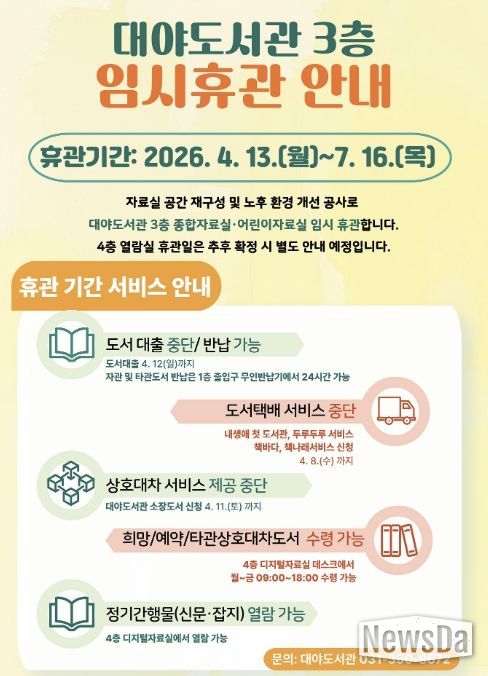 뉴스다 최광묵 기자 | 군포시 대야도서관은 노후된 자료실 환경을 개선하고 이용자 중심의 효율적인 공간 재구성을 위해 오는 4월 13일부터 7월 16일까지 리모델링 공사를 실시하고, 해당 기간동안 3층 자료실을 임시휴관한다고 밝혔다.