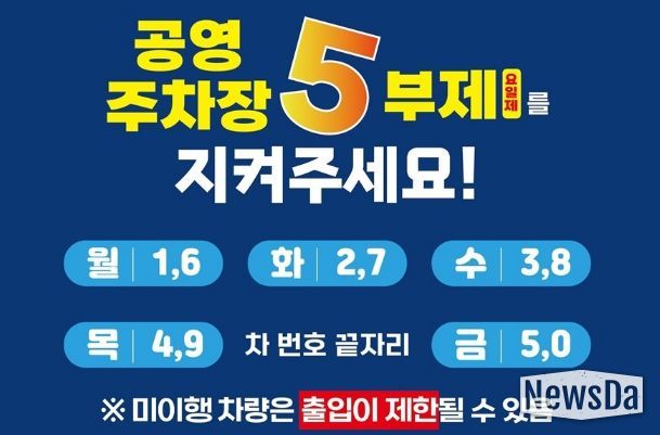 5부제 대상 차량은 차량번호 끝자리 숫자를 기준으로 월요일 1ܬ번 화요일 2ܭ번 수요일 3ܮ번 목요일 4ܯ번 금요일 5ܦ번이며, 5부제 의무 시행 주차장의 경우 5부제 대상 차량은 해당일에 입차가 제한될 예정이다. 다만, 장애인 차량·임산부·미취학 유아동승 차량, 전기·수소차량 등은 예외 대상으로 운영할 예정이다.
