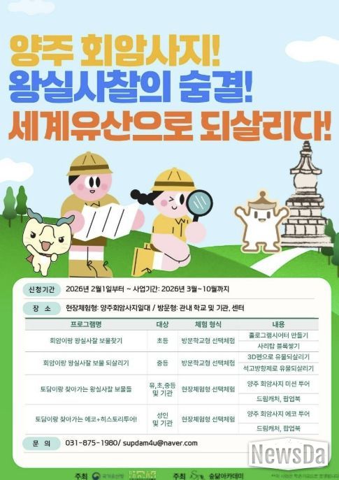 뉴스다 최광묵 기자 | 양주시립회암사지박물관은 복권기금으로 운영되는 지역 국가유산 교육 활성화 사업의 일환으로, 양주 회암사지의 역사와 주변 문화유산을 주제로 한 교육 프로그램 ‘양주 회암사지! 왕실사찰의 숨결! 세계유산으로 되살리다’를 운영한다.