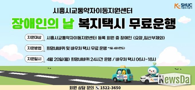뉴스다 최광묵 기자 | 시흥도시공사는 오는 4월 20일 ‘제46회 장애인의 날’을 맞아 교통약자의 이동 편의 증진과 사회참여 확대를 위해 무료 운행 서비스를 제공한다고 밝혔다.