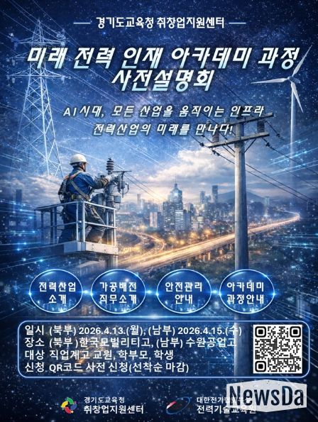 뉴스다 최광묵 기자 | 경기도교육청이 오는 13일과 15일 양일간 도내 직업계고 학생의 전력산업 분야 진로 탐색과 취업 역량 강화를 위한 ‘미래 전력 인재 아카데미 과정 사전설명회’를 개최한다.